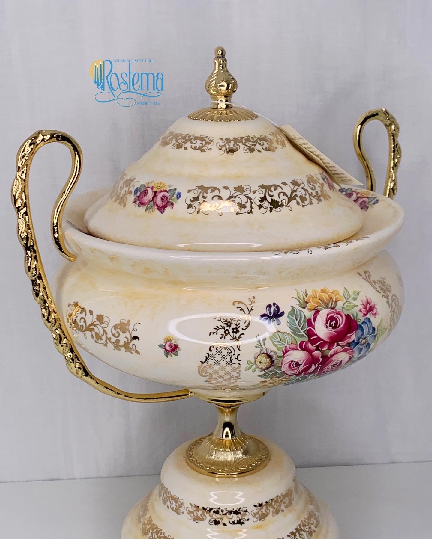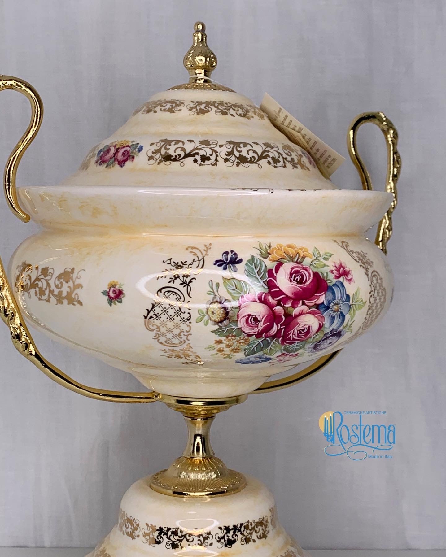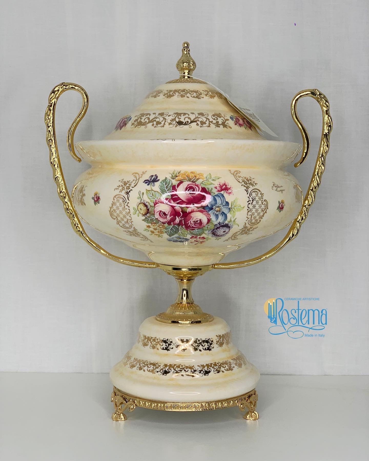 Ceramica smaltata cotta a gran fuoco, Ottone con bagno in Oro 24kt, Decorazioni in Oro.